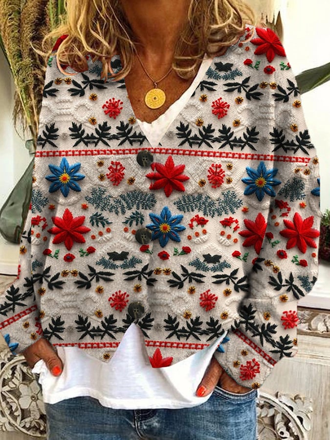 Christmas Print Casual Loose Buttoned Flannel Cardigan