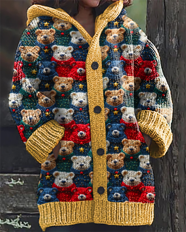Cute Colorful Bear Print Hooded Cardigan