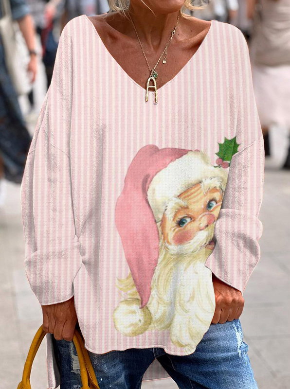 Pink Retro Santa Claus Printed V-neck Long-sleeved Top
