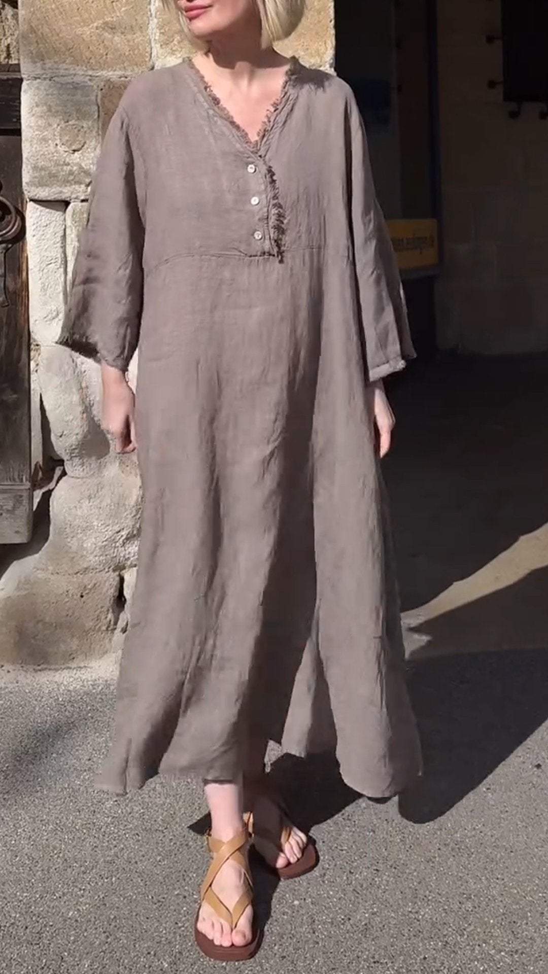 V-neck Cotton and Linen Long-sleeve Casual Dress
