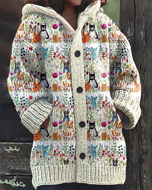 Vintage Cute Dog Floral Print Hooded Cardigan