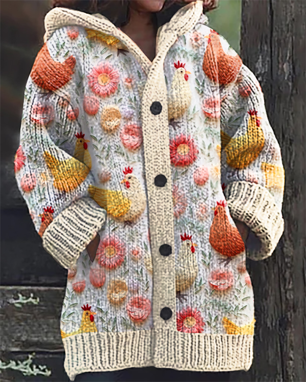Vintage Farm Chicken Flower Print Hooded Cardigan