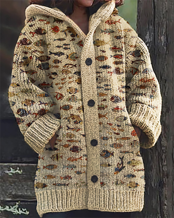 Vintage Fish Art Print Hooded Cardigan