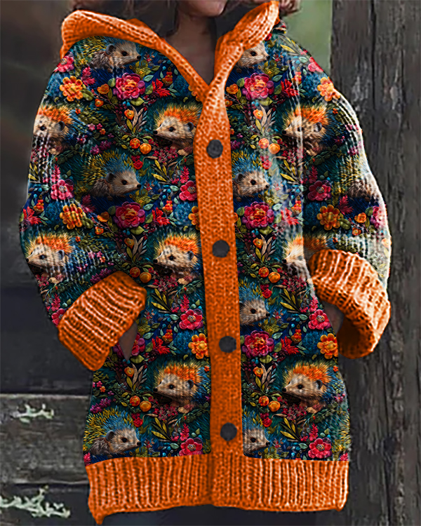 Vintage Hedgehog Floral Art Print Hooded Cardigan