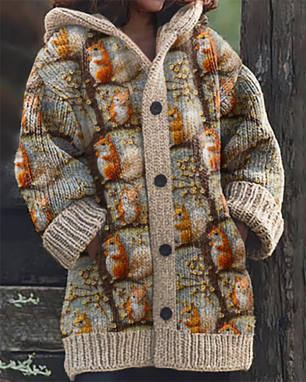 Vintage Squirrel Print Hooded Cardigan