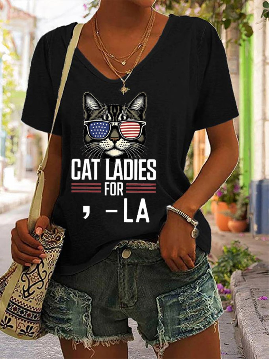 Women's Cat Ladies For Comma La Print V-Neck T-Shirt