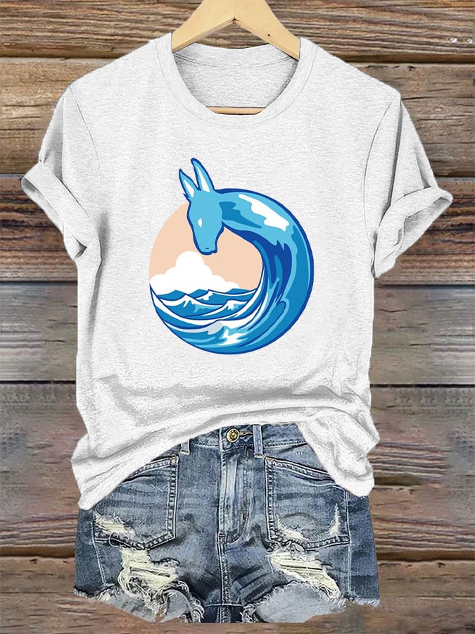 Women's Donkey Blue Waves Print Crew Neck T-Shirt