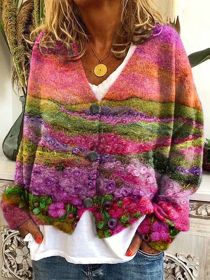 Women's Knitted Floral Print Plush Cardigan