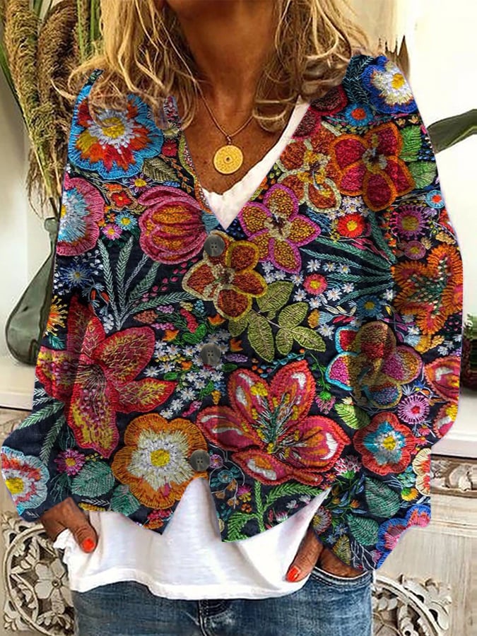 Women's Knitted Floral Print Plush Cardigan
