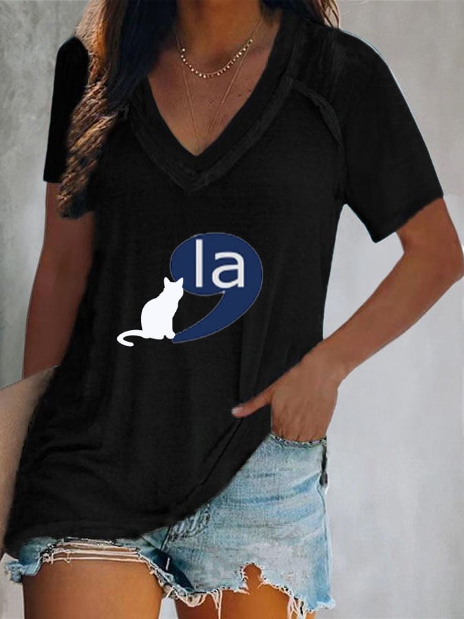 Women's LA Love Cat Printed Casual V-Neck T-Shirt