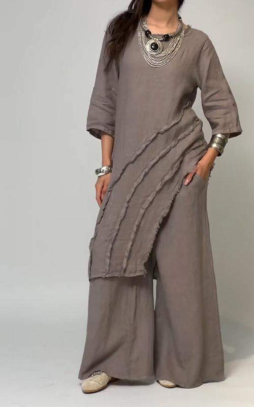 Women's Round Neck Long Cotton and Linen Two-piece Suit