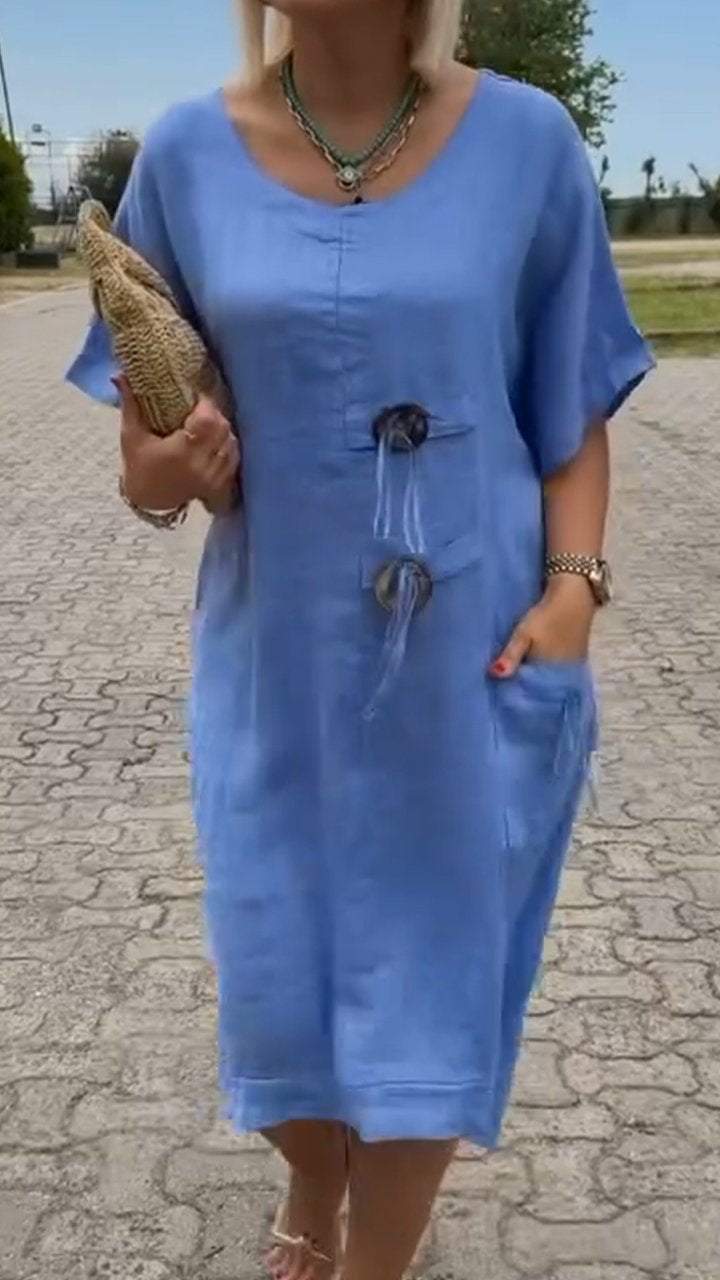 Women's Round Neck Short Sleeve Cotton and Linen Dress