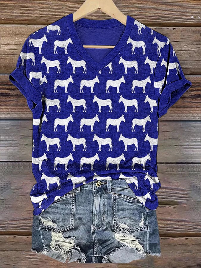 Women's Support Blue Donkeys Print V-Neck T-Shirt